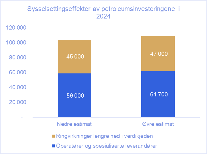 SSBs siste investeringstelling viser totale petroleumsinvesteringer på 256 milliarder kroner i 2024. Disse investeringene har alene gitt grunnlag for i overkant av 100 000 sysselsatte, viser beregninger foretatt av Menon Economics. Dette er sysselsatte i operatørselskapene, hos leverandører og deres underleverandører. Sysselsettingsvirkningene er fordelt utover hele landet.