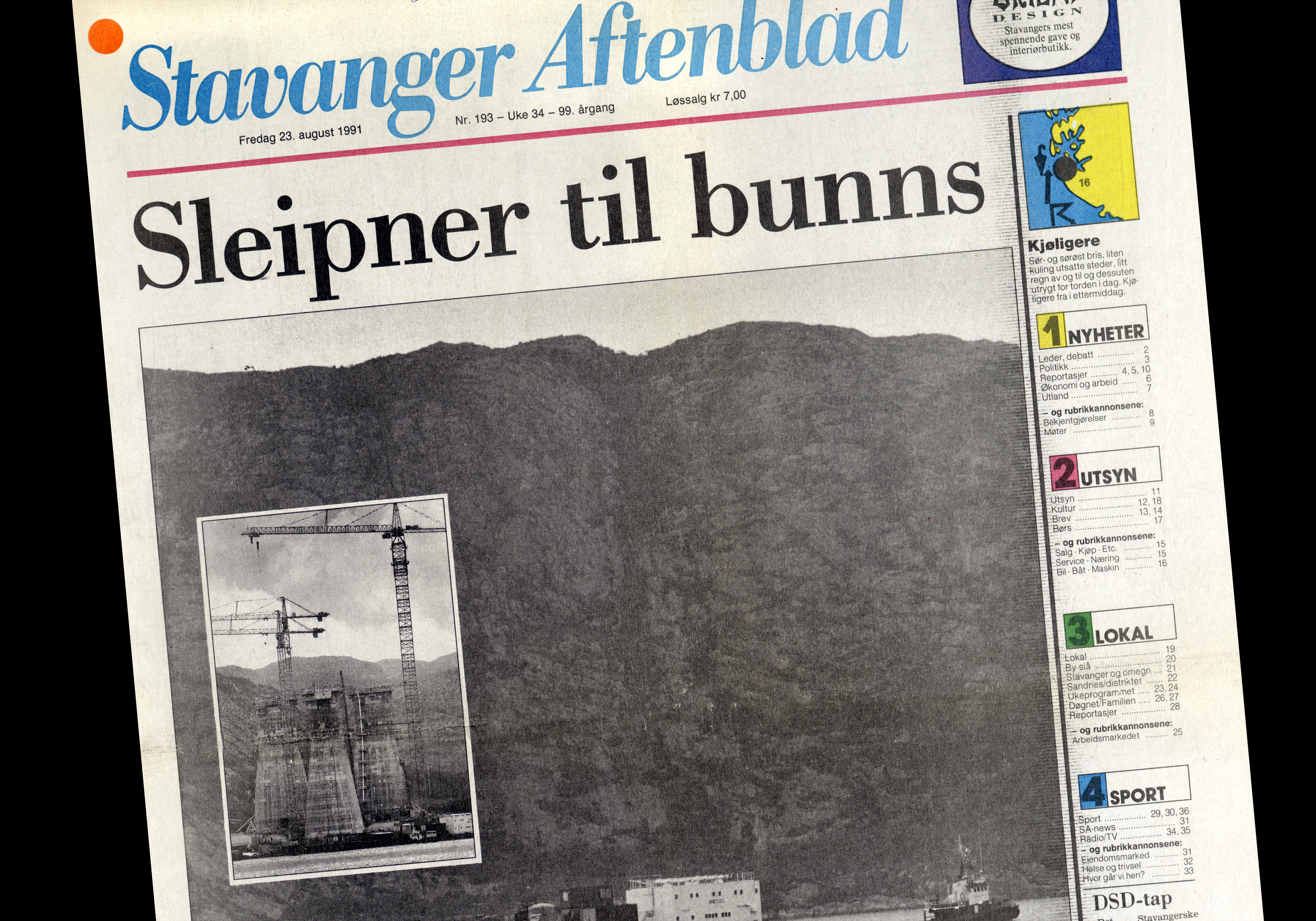 23. August havarerte betongunderstellet til Sleipner A-plattformen under pålagt prøvenedsenking i Gandsfjorden ved Stavanger. Ulykken skyldtes en konstruksjonsfeil. Ingen personer omkom i ulykken. Norwegian Contractors (NC) bygde et nytt understell som ble ferdig i tide slik at produksjonen kunne starte til planlagt tid to år senere.