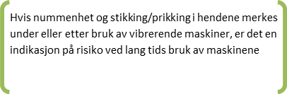 Arbeid med verktøy som vibrerer kan gi nedsatt følelse i fingrene og dårligere finmotorikk. Dette kan medføre problemer med presisjonsoppgaver og med å håndtere maskiner. Disse symptomene forsvinner normalt 10-30 minutter etter man slutter å bruke verktøyet.